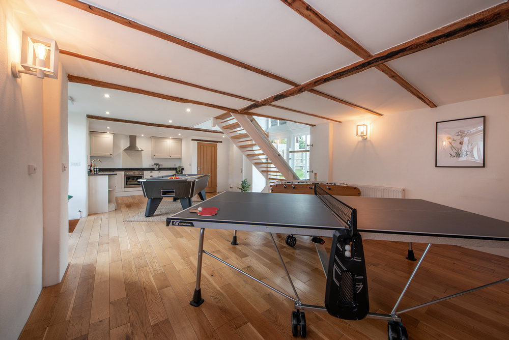 What’s great about the large holiday houses here at Stonehayes Farm is that they have something for all ages. We can provide cots and highchairs for babies and toddlers, each cottage has a private hot tub and a large garden with a trampoline or play equipment; Julesbrook has its own games room but there’s also another games room on site for all guests to use. And then there are 15 acres of private grounds where you can walk the dog, play in the fields, and have lazy picnics by the river.